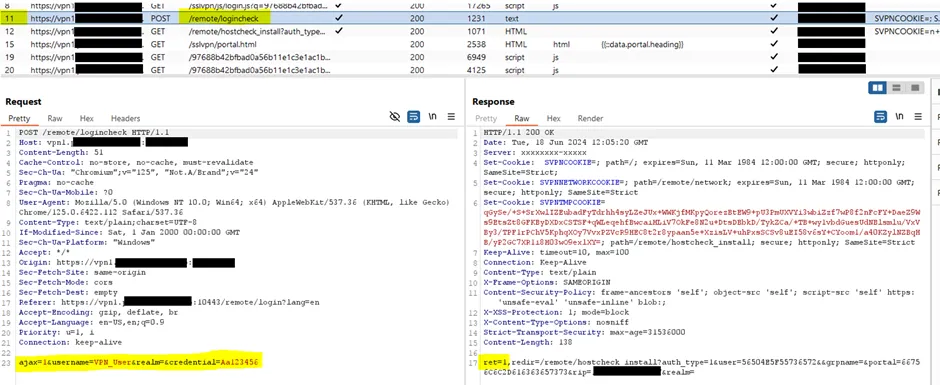 We began by recording the interactions between the client and the VPN server using Burp Suite. Through detailed research, we discovered that a simple HTTPS request initiates the authentication attempt against the server. This discovery was pivotal as it allowed us to understand the initial stages of the authentication process.